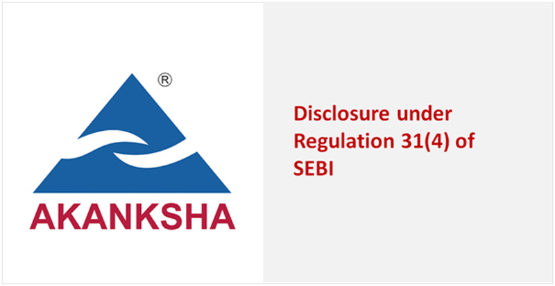 6 June 2025 - Akanksha Power and Infrastructure Limitedhas Submitted to the Exchange a copy of Disclosure under Regulation 31(4) of the SEBI (Substantial Acquisition of Shares and Takeovers). Bipin Bihari Dasmohapatra, Promoter of Akanksha Power And Infrastructure Limited ("the Company") declares that I and other Promoter Group members did not encumber shares in the Company during Financial Year ending March 31, 2025.